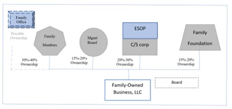 LLC - entity flexibility and ownership: The choice of entity structure appropriate for most family businesses is a limited liability company with the following characteristics: (i) ownership allocation that stabilizes the operations and the decision-making process; (ii) ownership that can fluctuate ased on the liquidity needs of the family members, the management team, the ESOP and the foundation; (iii) ownership that permits different classes of equity of the business (different attributes, such as voting rights, distribution rights, valuation rights and repurchase rights); and (iv) ownership that structurally results in the family, the management team and the employees having a common ggoal to preserve and sustain the business. The ownership percentages will fluctuate over time, depending on the needs of the family. Based on my experience in implementing these types of structures over the last 10 years, the rule of thumb is to maintain the ownership percentages within the ranges set forth in the above diagram.